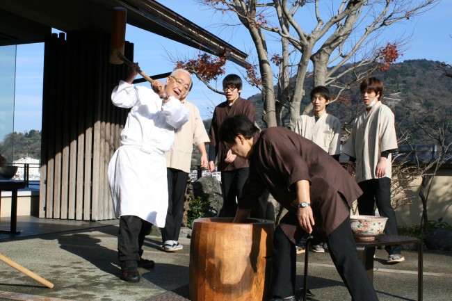 2016.01.03 運営日記 御餅つき 元旦と今朝は御餅つきを行いました。 両日ともに天候にも恵まれ、お客様にもご参加いただき 例年以上に盛り上がりました。 その後は、小豆・きな粉・大根おろしとご用意しお召し上がりいただきました。