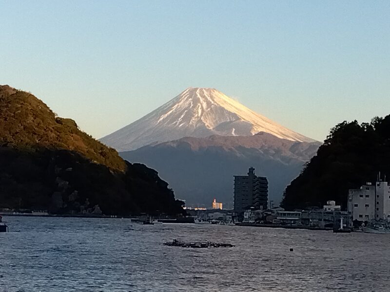 澄んだ青空に朝焼けした富士山が雄大に見えています。