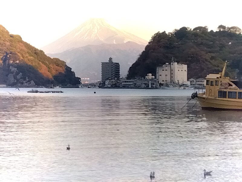 今朝三津浜には多くの水鳥が羽根を休め、金色の富士山を眺めておりました。