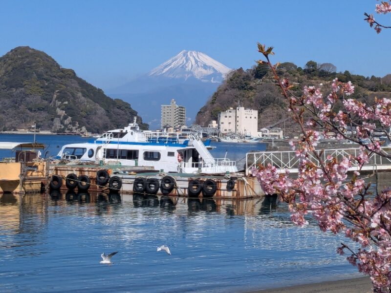 2026.02.21 本日の富士山 本日の富士山 少しずつ日脚が伸び、吹く風にも春の匂いが感じられます。 青空の下 海鳥たちが気持ちよさそうに水面を行き来しています。 三津浜の桜も満開になっています。富士山と一緒にご覧ください。